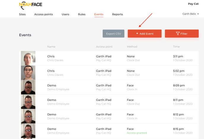 Instead of adding timesheets directly in Employment Hero Payroll, the clock in/out events should be added through NoahFace. This can be done by opening the NoahFace dashboard, navigating to Events, selecting Add Event.