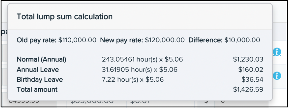 Total lump sum: The amount populated in this field is the total back pay owing from the employee’s effective date up to the last pay run that the employee was paid at their old rate. Hovering your mouse over the tooltip info icon will display a breakdown of how the lump sum amount was calculated.