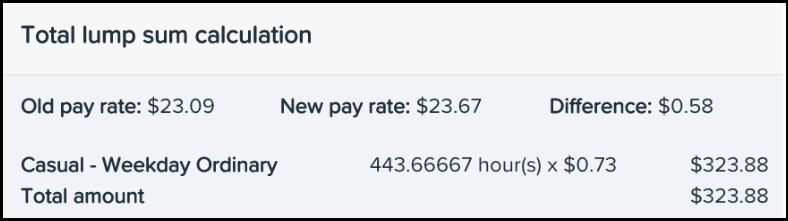 - For employees who have a rate loading associated with their base rate of pay, such as casuals, the old and new pay rates will display their base rate, i.e., excluding the loading. However, the breakdown will be inclusive of rate loading. Referring to the below screenshot as an example, the difference in old and new rates is $0.58 per hour. The rate used to calculate the breakdown, however, is inclusive of the loading, being $0.58 * 25% loading = $0.73.
