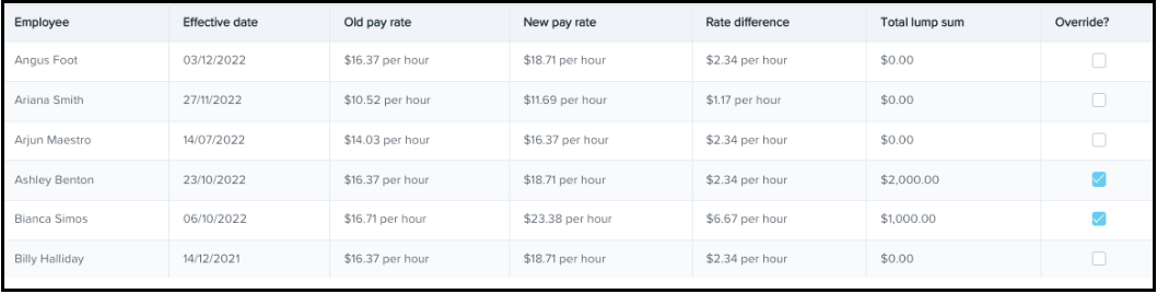 Old pay rate: The figure populated in this column is the pay rate that applied to the employee prior to being updated. If, for any reason, you want to change the figure entered in this field you can do so by clicking on the Override checkbox. This will open up the Old pay rate and Total lump sum fields thereby allowing the user to enter a different old pay rate. Beware that the platform will not recalculate the total lump sum amount if the old pay rate amount is overridden. Instead, the total lump sum amount will also need to be manually entered. If you want to revert back to platform-generated amounts, simply untick the Override checkbox.
