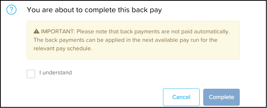 Complete: Once you have reviewed the back pay records for eligible employees and are 150% confident that the records can now be processed in the pay run, click on Complete. Marking the record as complete signifies it is ready to be processed in the pay run and, as such, will lock the records whereby they cannot subsequently be edited. You cannot edit or delete a back payment after marking it complete. This means you need to make all required edits before clicking the Complete button. Once you click on Complete, the following modal will display: This warning displays to clarify that the platform will not automatically process these back pays in the background. Instead, the back payment records will display when (a) the pay run associated with the employee’s pay schedule is subsequently created or (b) an adhoc pay run is created and the employees associated with the back payments are manually added to that adhoc pay run. In order to proceed, you must tick the I understand checkbox and then click Complete.