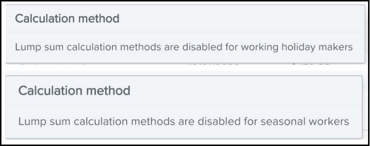 Special mention for working holiday makers and seasonal workers: For any employee classified as either of these (which is configured in the Tax calculation options within the employee’s Tax File Declaration screen), take note that methods A and B do not apply to these employees. This is because they have their own special tax arrangements which include back payments. In this instance, you will notice that the calculation method is not configurable for these employees. Instead, a tooltip will appear in the calculation method column, as follows: