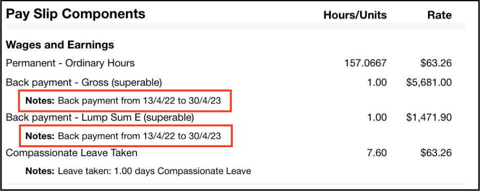 From the Back payment tab in the pay run, you can add a note against the employee’s back pay. If the Show line notes setting is turned on via Payroll Settings > Pay Slips, the note will display in the pay slip as per the following example: