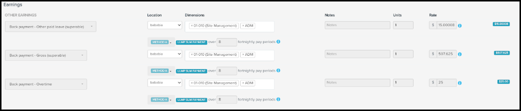 Where there is a back payment that meets the Lump Sum E criteria, this portion of payment will be separated from non-Lump Sum E payments. Additionally, regardless of the calculation method chosen for the back payment of an employee, the platform will override this method for any Lump Sum E earnings, in order to comply with the ATO requirements for taxing a Lump Sum E payment. Lump Sum E payments will be taxed using method A for the number of pay periods applicable over a financial year. When calculating the pay periods for a non-Lump Sum E back payment, where there is also a Lump Sum E payment, the platform will exclude the pay periods associated with the Lump Sum E earnings.