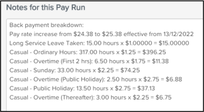 Additionally, so that the employee has further detail on what the back payment consists, the platform includes the breakdown in the employee’s pay within the Notes for this Pay Run field, as per the following example: