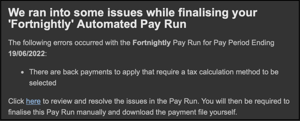 If you have configured a pay schedule to be processed automatically, please note that any pay run containing back payments will cause the automation to stop. An email notification will be sent to the relevant parties advising this is the case and the reason, for example: